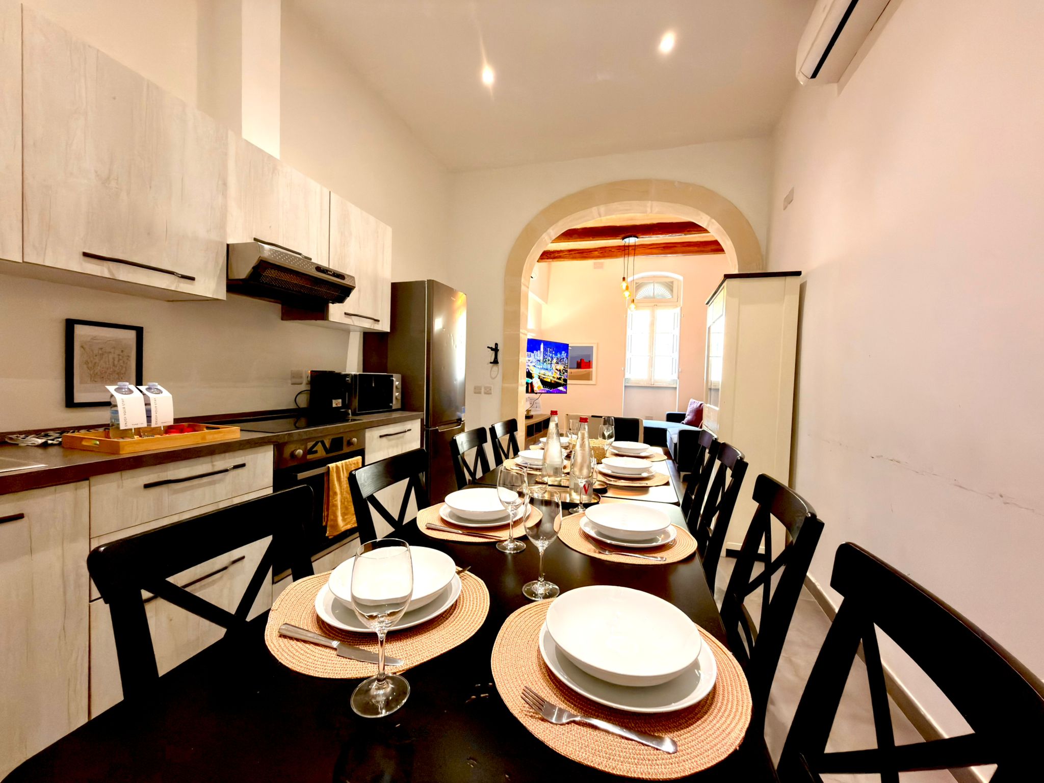 The exposed stone walls, arched doorways, and intricate tile work showcase the unique charm of the island. The house is also equipped with air conditioning and heating, ensuring your comfort no matter the season.